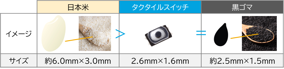 2.6mm×1.6mm形SMDは黒ゴマひと粒と同じくらいの超小型サイズです。小さなスイッチの中にクリック感触を実現する可動接点を収める必要があるので、パーツを小さく・薄くしなければいけません。