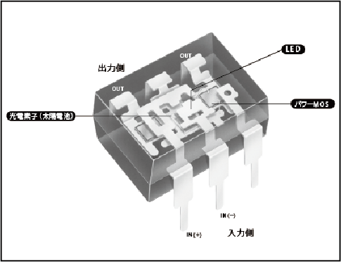 PhotoMOS®リレーは入力側のLED(発光ダイオード)と、出力側の光電素子(太陽電池)によって接点の開閉を行なうリレーです。
