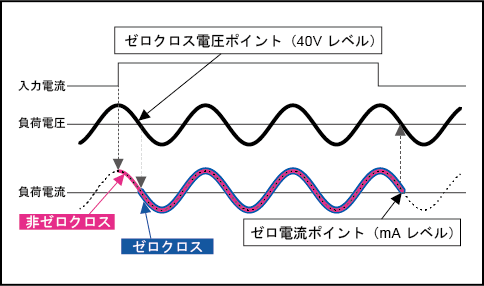 ゼロクロスタイプのSSRは、内蔵されているゼロクロス回路により、交流のゼロボルト付近でない地点で入力信号が入った場合でもゼロボルト付近でON動作を行います。低い電圧の時点でONすることによってスイッチングノイズの発生や突入電流の発生を抑えることができます。またOFFする場合、入力信号がOFFになっても、SSRの動作はすぐにはOFFにはならず、負荷電流がほぼゼロ電流になった時点でOFFになります。