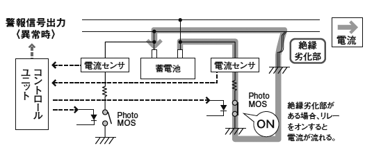 PhotoMOS リレーは、蓄電池ユニット内の絶縁劣化を監視する用途に使用されます。
