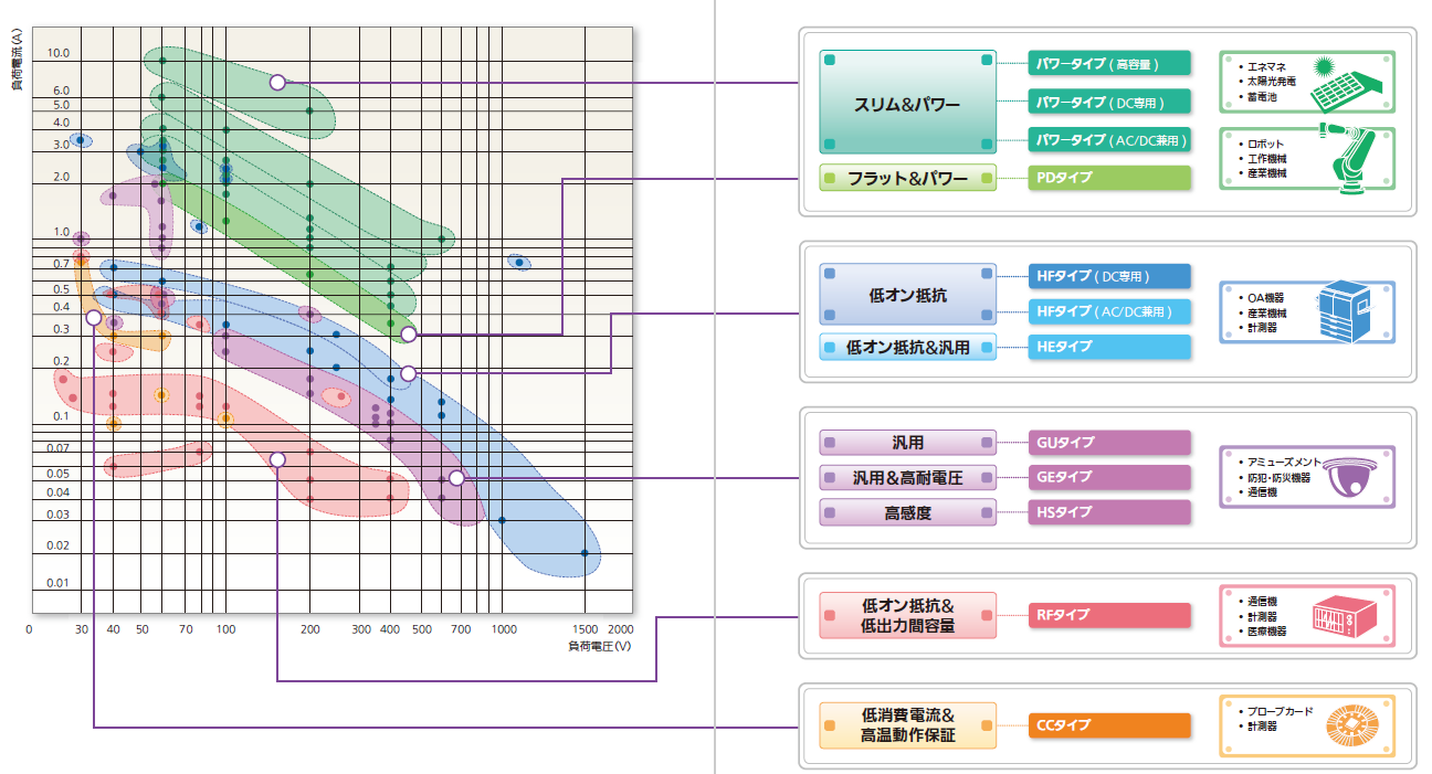 色分けされた領域が各 PhotoMOS リレーのタイプを表しており、右側にそれぞれの特長とタイプ名を記載しています。